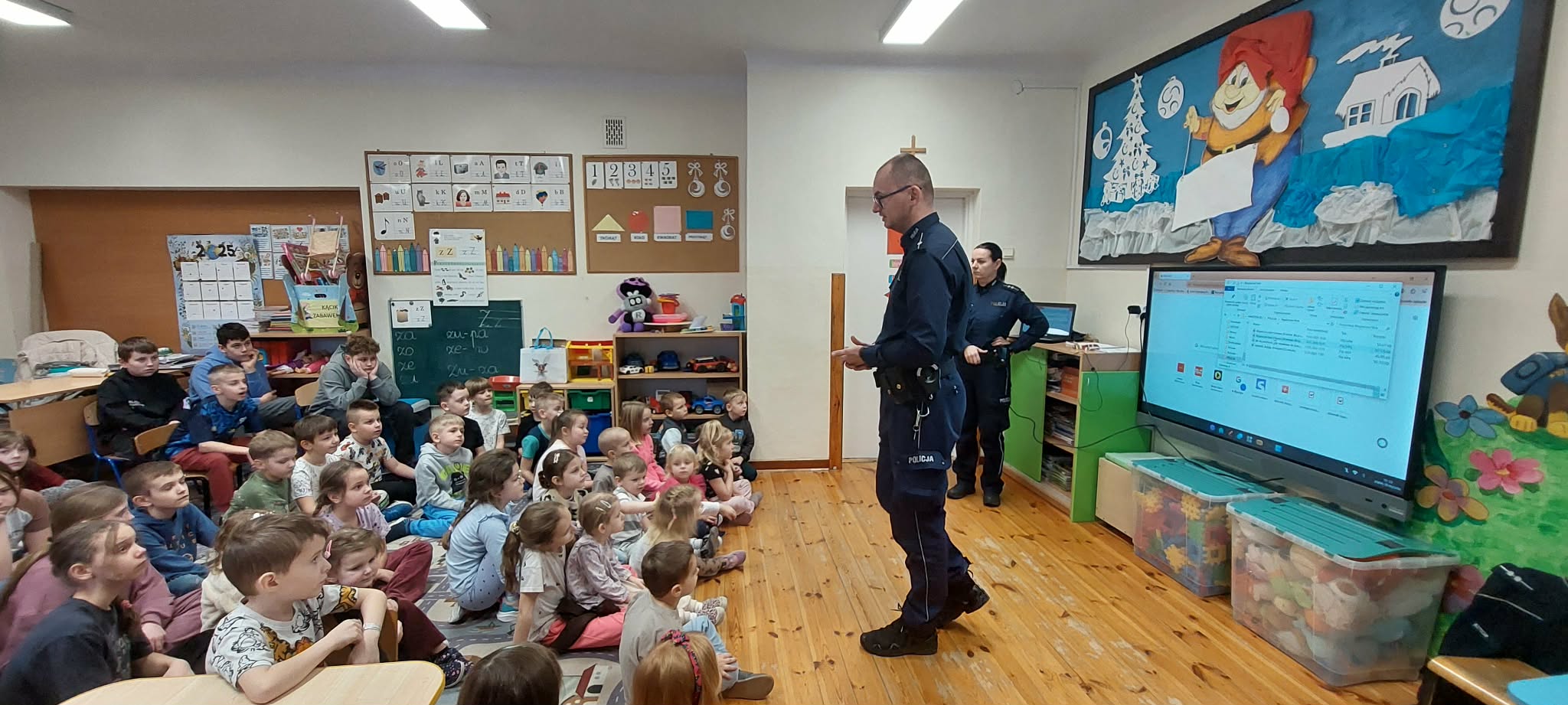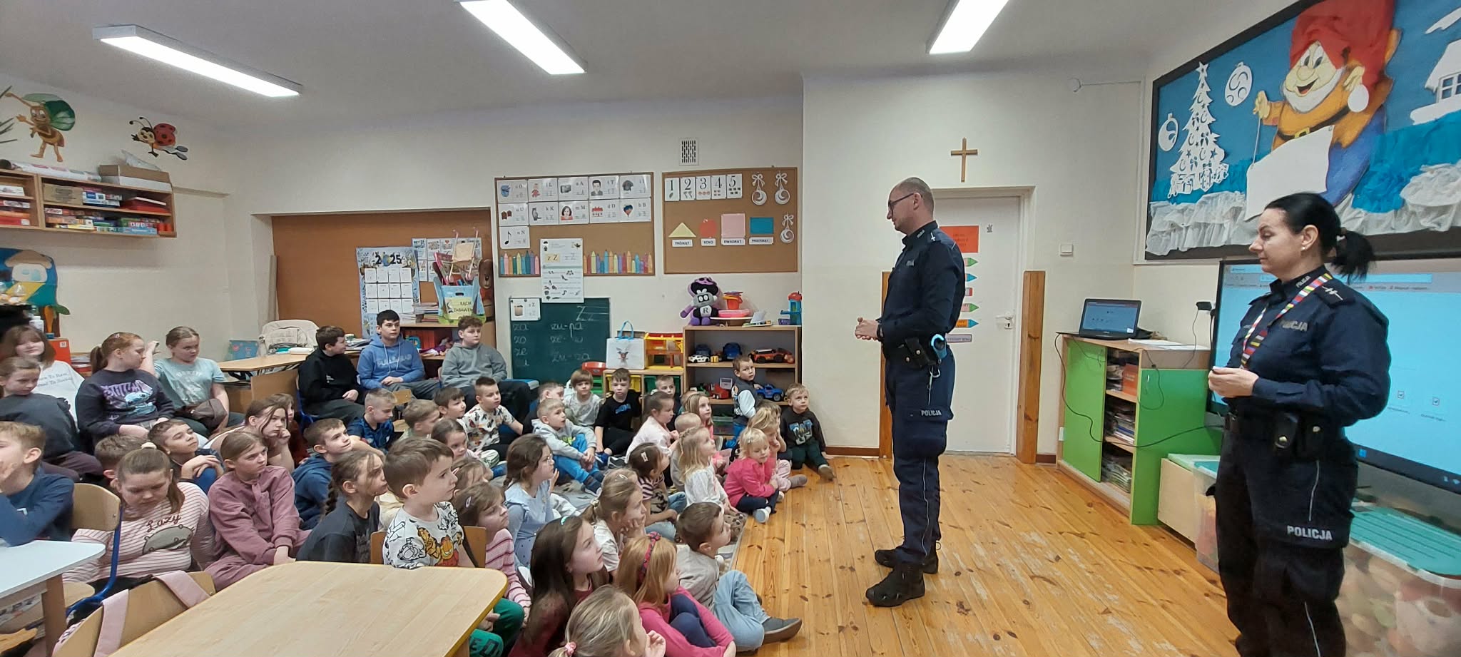 30 stycznia, tuż przed rozpoczęciem ferii zimowych do naszej placówki zostali zaproszeni policjanci w celu przeprowadzenia pogadanki na temat : Bezpiecznych ferii”. Z dziećmi spotkali się policjanci z Komendy Policji w Opocznie, którzy przypomnieli zasady bezpiecznych zabaw na śniegu oraz co jest stanowczo zabronione. Przedszkolaki oraz uczniowie klas 1-8 dodatkowo obejrzały film edukacyjny, który później został szczegółowo omówiony.